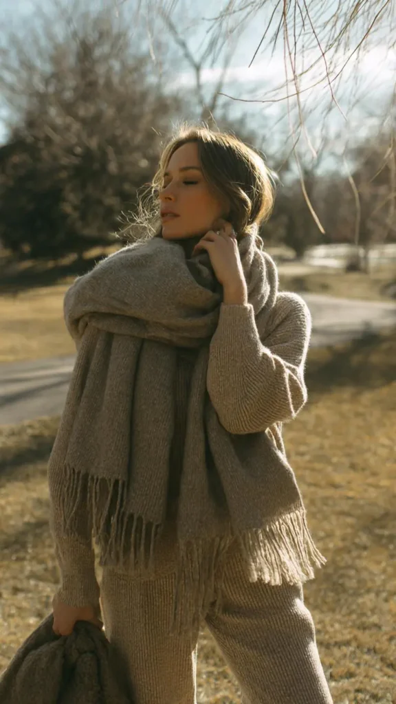 A matching knit set paired with a large scarf brings extra comfort. This outfit suits relaxed gatherings and keeps you warm without losing style.