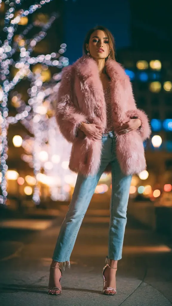 A faux fur coat adds a luxurious layer to simple denim. This look works when you want your Thanksgiving outfit to feel relaxed but polished.