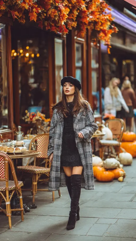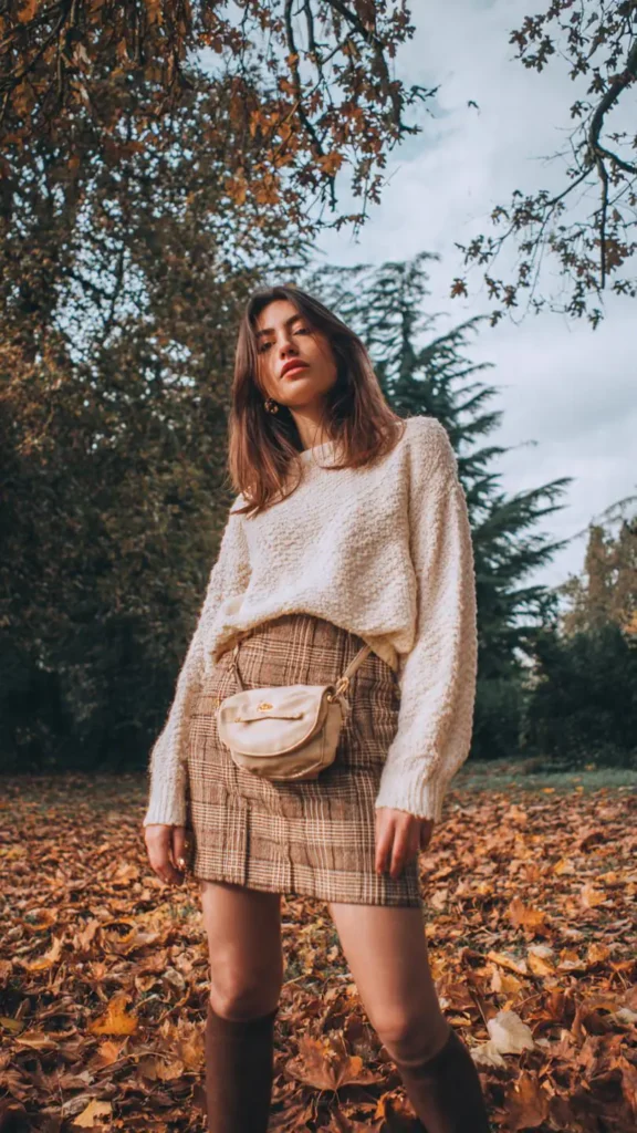 A plaid skirt and an oversized sweater pair perfectly for fall gatherings. The mix of prints and textures brings a playful, preppy feel. This outfit suits casual brunches or relaxed dinners where you want to stay cute but comfortable.