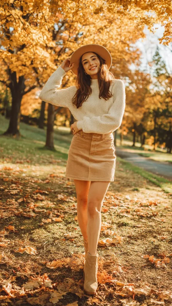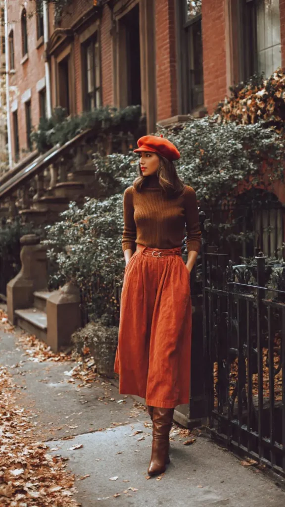 Corduroy and knits embody the warmth of the season. A soft sweater paired with a simple corduroy skirt gives a nostalgic fall touch that works beautifully for casual Thanksgiving plans.