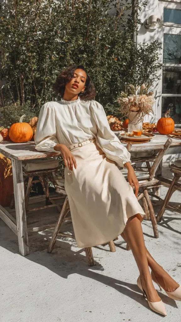 Puff sleeves add a gentle, feminine touch when paired with a midi skirt. This outfit fits Thanksgiving celebrations where you want something pretty but comfortable.