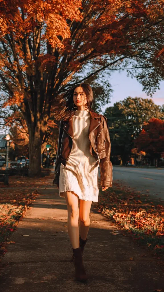 A leather jacket over a knit dress creates a mix of strong and soft elements, giving your Thanksgiving look a casual edge.