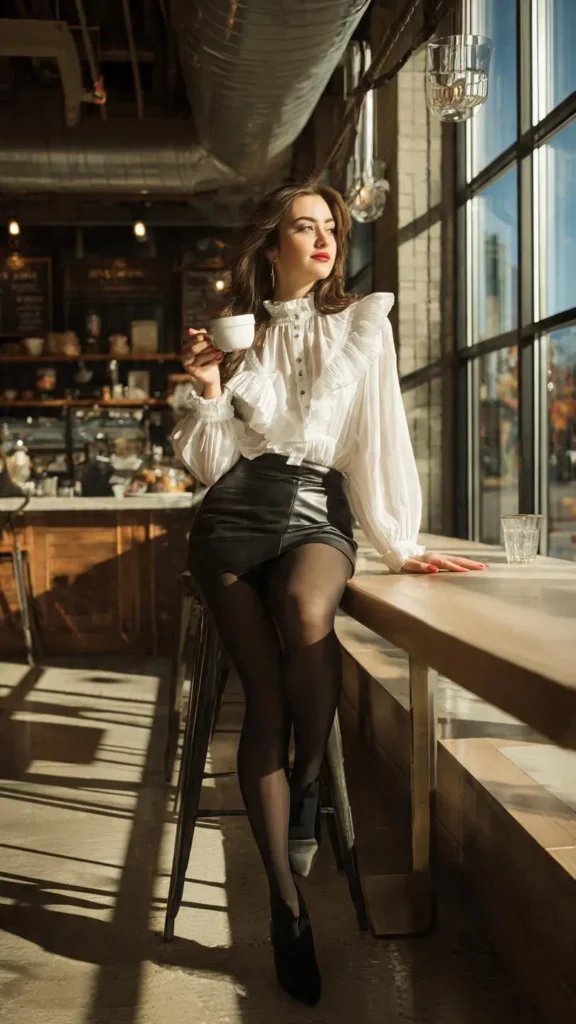 A ruffled top brings a soft dramatic touch when paired with a sleek skirt. It’s great for Thanksgiving gatherings where you want a mix of charm and edge.