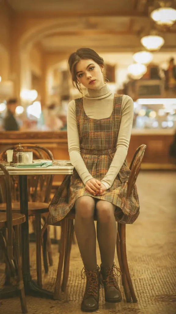 Layering a plaid dress over a fitted turtleneck makes a warm and classic outfit that suits fall gatherings.