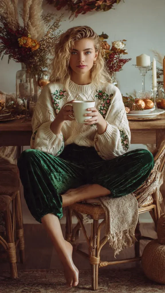 Velvet pants paired with a cheerful sweater create a warm, festive Thanksgiving look that feels fun and seasonal.