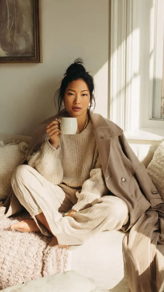 A coordinated knit set offers the comfort of loungewear while still looking thoughtful. Neutral tones and gentle accessories can make the outfit feel elevated enough for a Thanksgiving meal.