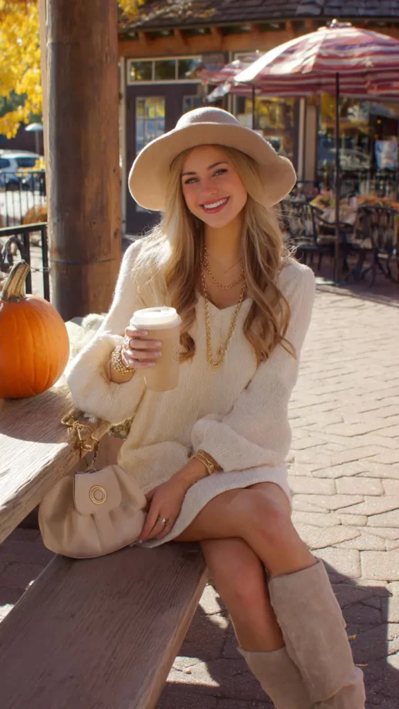 An all-cream outfit feels clean, modern, and luxurious. Mixing textures adds depth and keeps the look interesting for Thanksgiving.