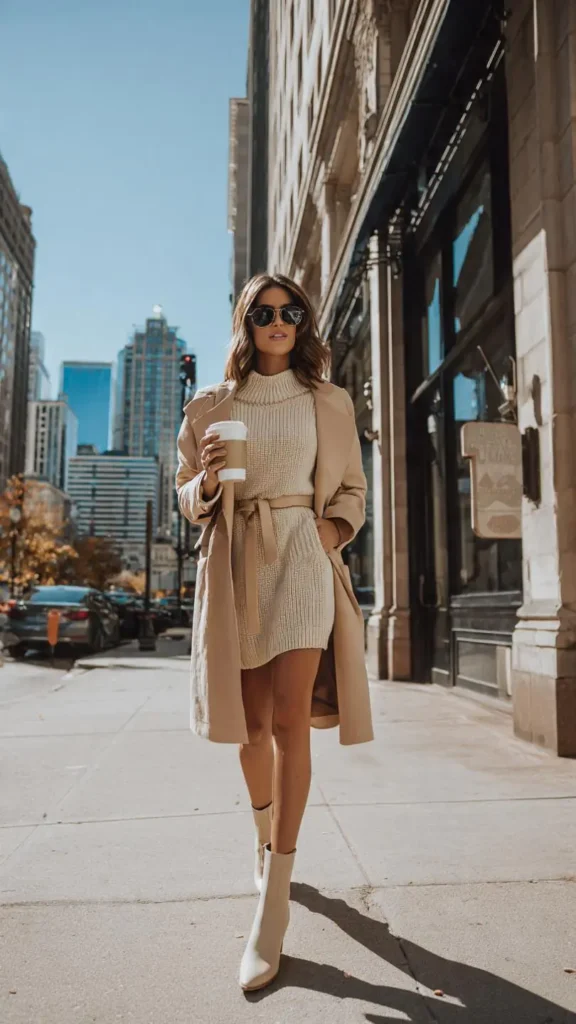 Layering a belted coat over a sweater dress shapes the outfit while adding warmth. This combination blends comfort and style in a way that fits the Thanksgiving mood.