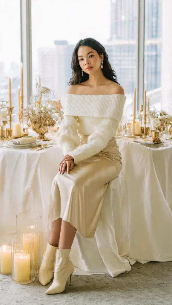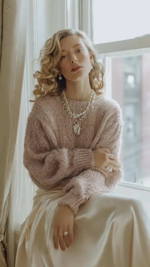 Pairing a warm sweater with a smooth satin skirt creates a pretty contrast. This combination gives a calm, feminine energy that suits Thanksgiving and seasonal celebrations.