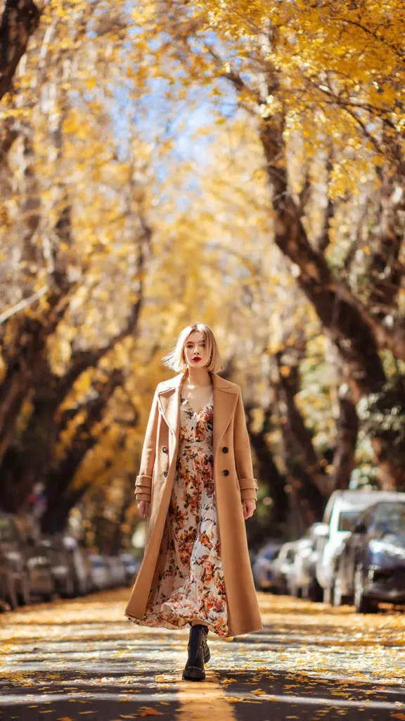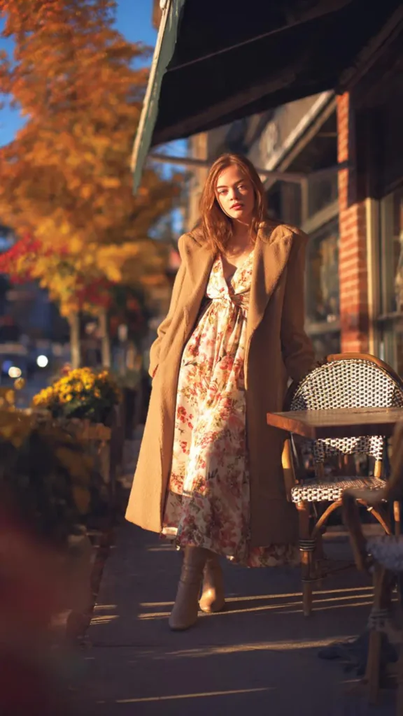 A camel coat paired with a printed dress gives a gentle, elegant Thanksgiving outfit that feels timeless.
