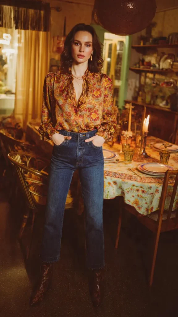 A floral blouse tucked into high-waisted denim creates a calm, effortless outfit that’s perfect for a Thanksgiving dinner at home or out.
