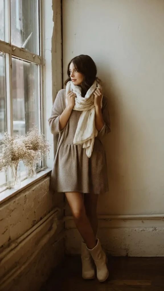 A fitted knit dress becomes even cozier when paired with a big scarf. It’s ideal for staying warm while still looking polished.