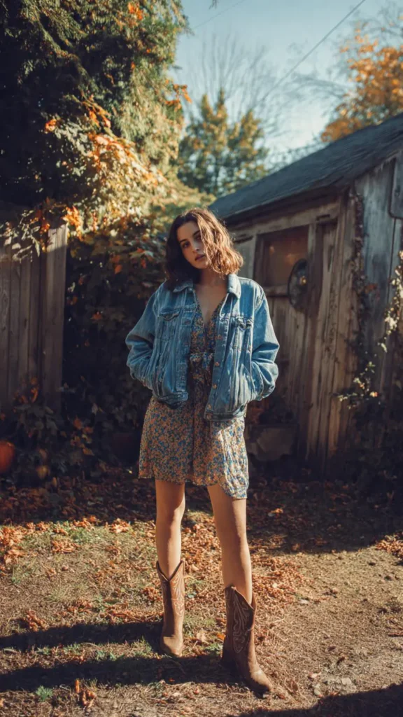 A floral dress with a denim jacket makes a simple, feminine outfit for casual Thanksgiving activities. It’s comfortable and always dependable for outdoor or relaxed settings.