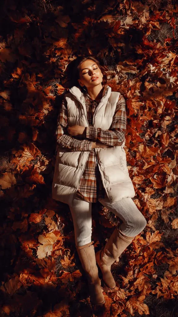 A puffer vest layered over plaid offers a warm, outdoorsy style. It works well for relaxed Thanksgiving plans and keeps things casual while still cute.