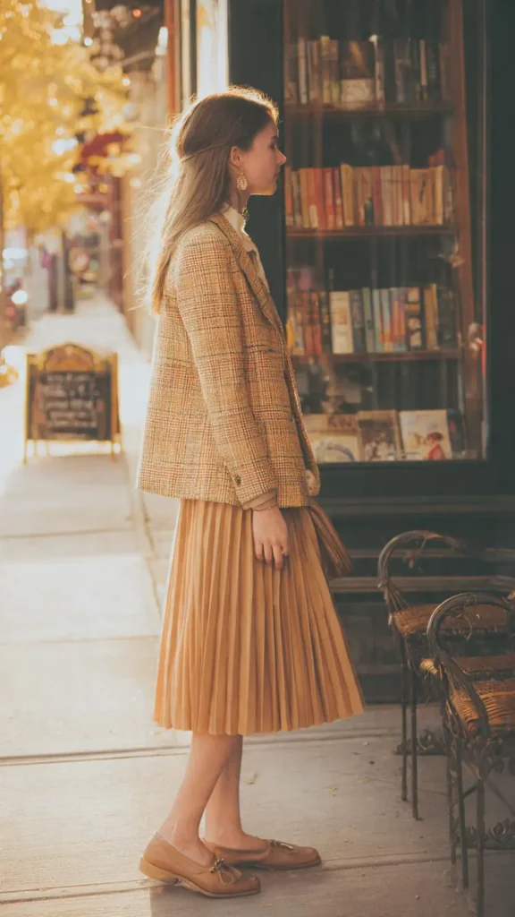 A checked blazer adds structure while a pleated skirt creates movement. Together, they give an academic-inspired Thanksgiving outfit that’s polished but youthful.
