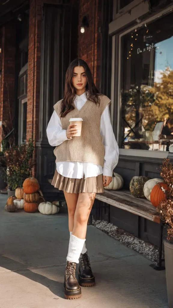 A sweater vest over a simple shirt creates a clean, youthful look that fits the season. Pairing it with a skirt or structured pants gives it a polished tone while keeping the outfit modern and fun for Thanksgiving.