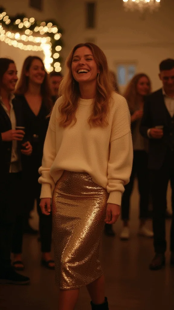 A sequin skirt instantly brightens up winter, and wearing it with an oversized sweater tones down the sparkle in a stylish, cozy way. The contrast between the shimmering skirt and relaxed top makes the outfit feel effortless yet festive. It’s the kind of look that works for holiday gatherings, winter dinners, or any moment when you want a touch of glam without going over the top.