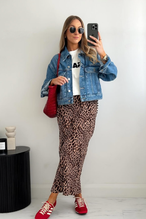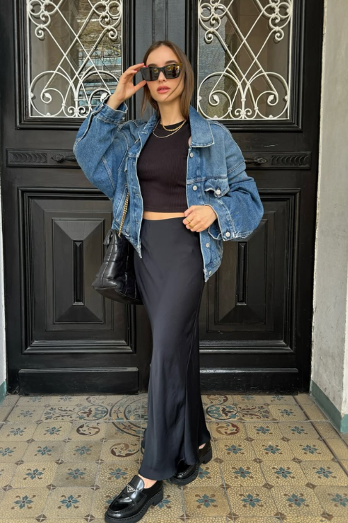 This is one of my favorite ways to soften denim. The flowy skirt adds movement, and the jacket keeps it grounded and practical.