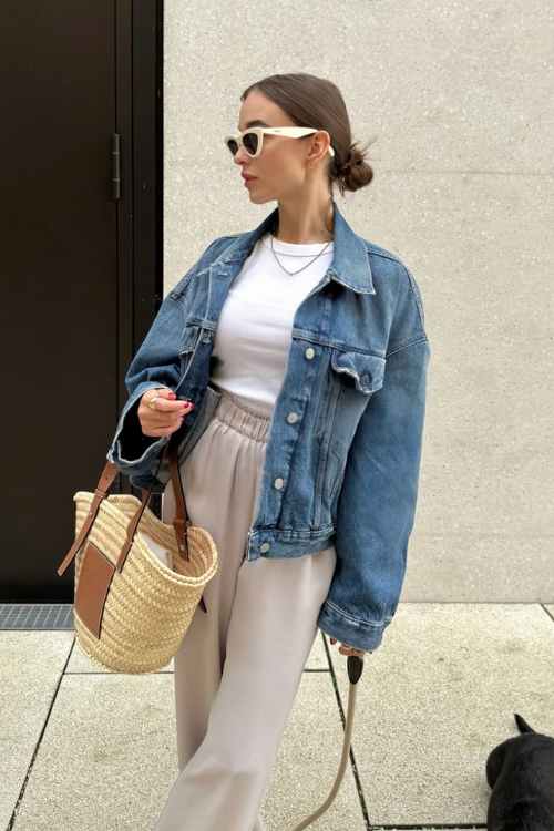This is perfect for warmer days. Linen keeps it breathable, and the denim jacket adds just enough layering without overheating.