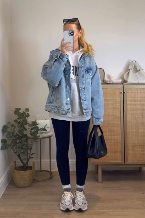 This is one of my go-to outfits when comfort is the priority. I throw on a hoodie and leggings, then layer a denim jacket to make it look intentional instead of lazy.