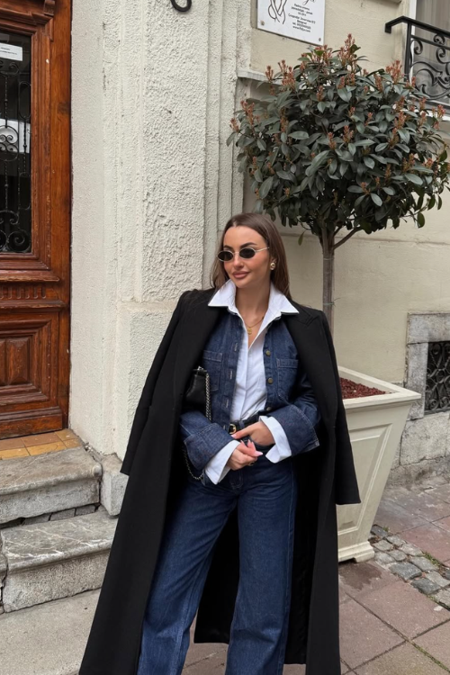 Layering a long coat over denim instantly makes the outfit look expensive. I usually stick to neutral coats because they elevate the entire look without effort.