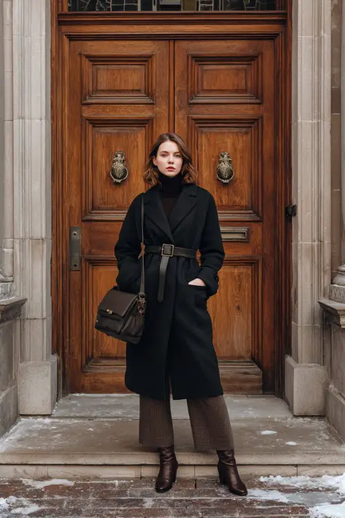 A belted black wool coat worn over dark trousers creates a classic winter outline that feels intentional and neat. Dark leather ankle boots add warmth and durability, while a structured shoulder bag enhances balance and refinement. This outfit works well for everyday winter wear while maintaining a timeless old money aesthetic.