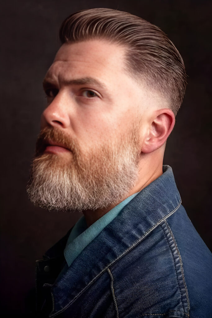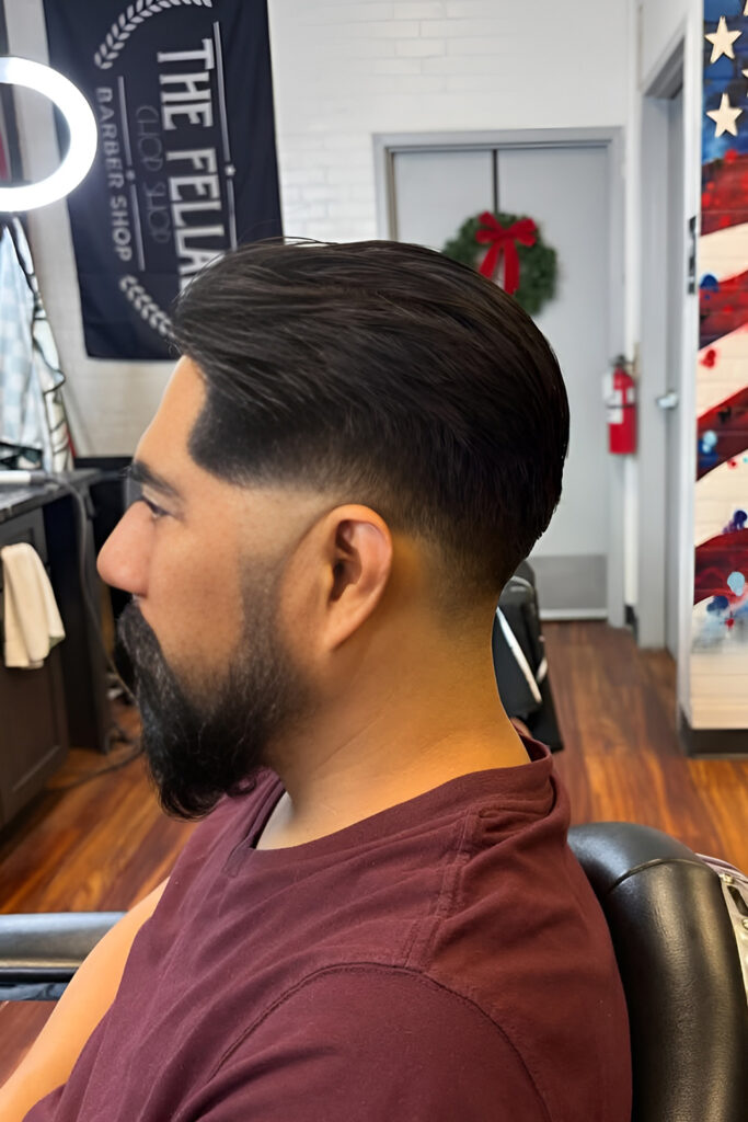 This style is all about precision. The fade is smooth, and the beard is shaped with clean lines and symmetry.