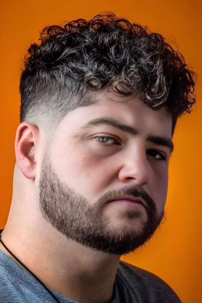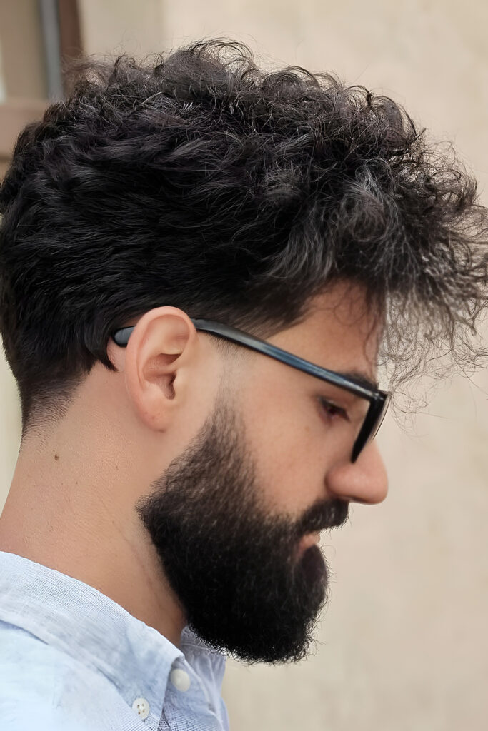 7. Curly Top Taper Fade with a Beard