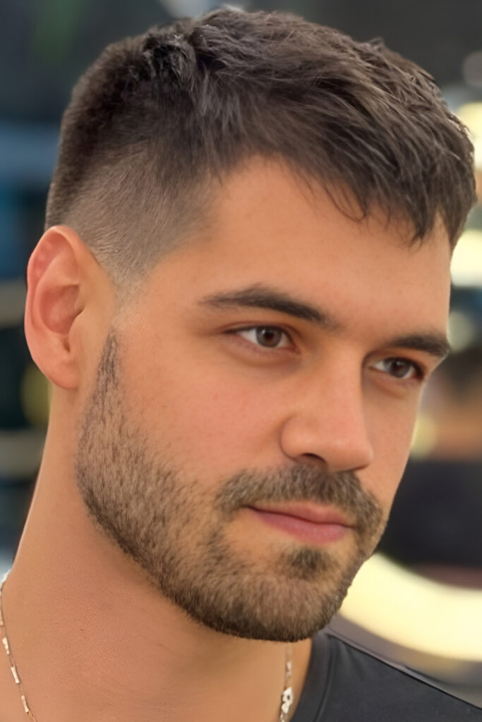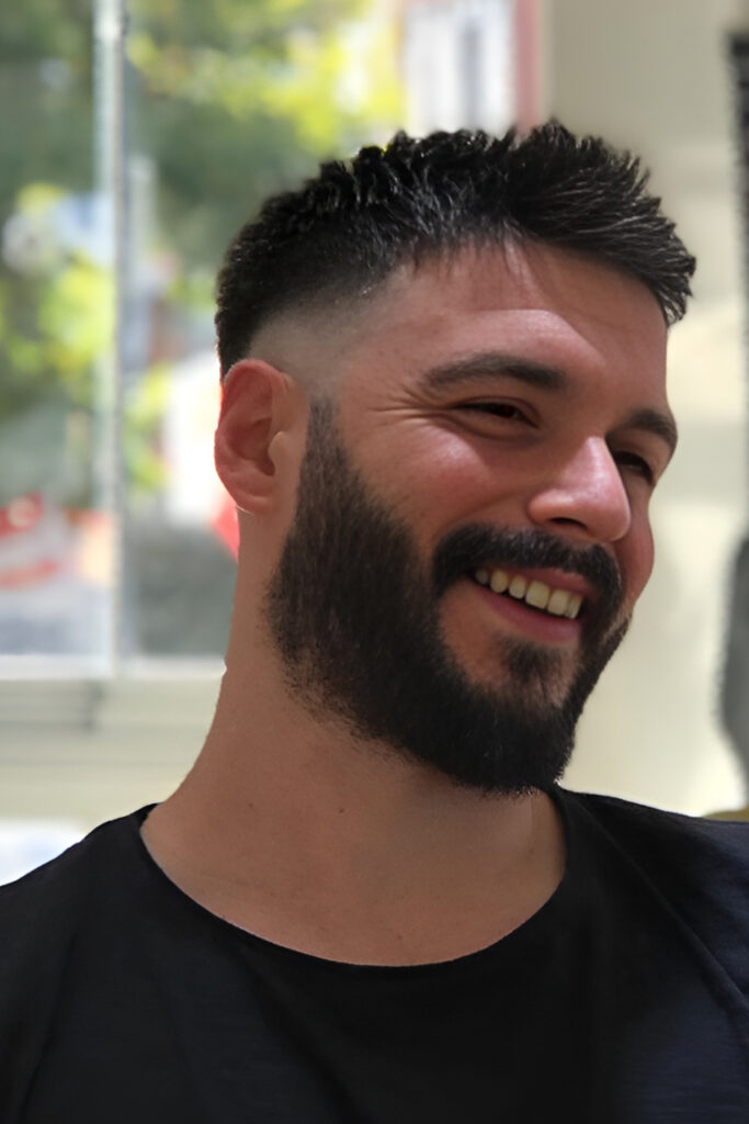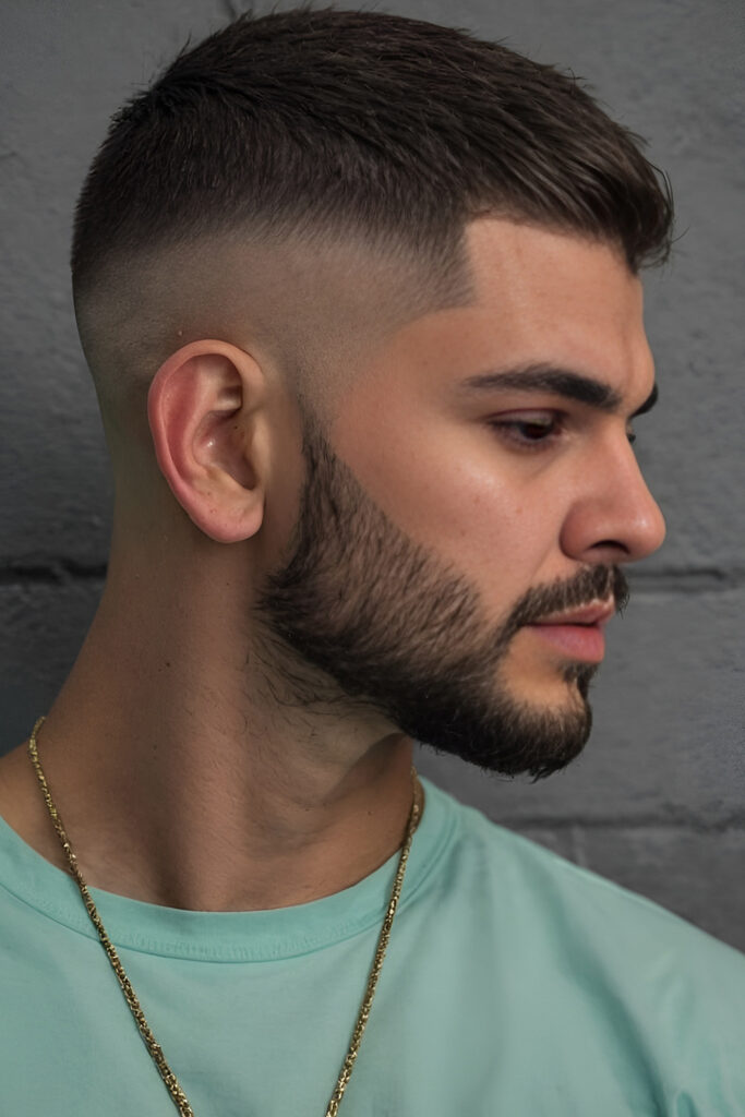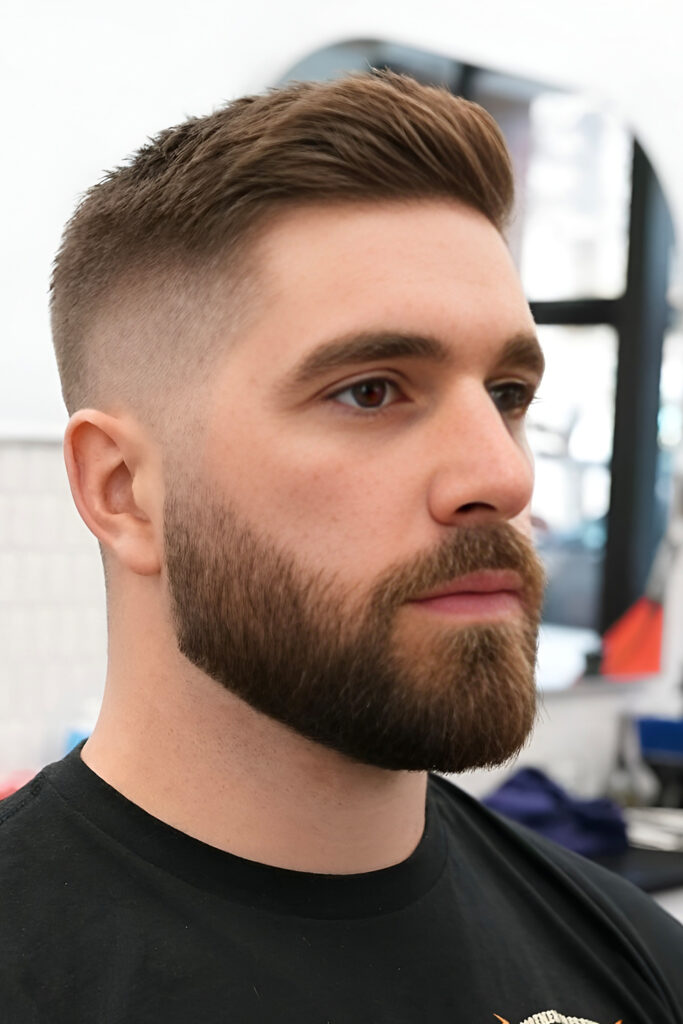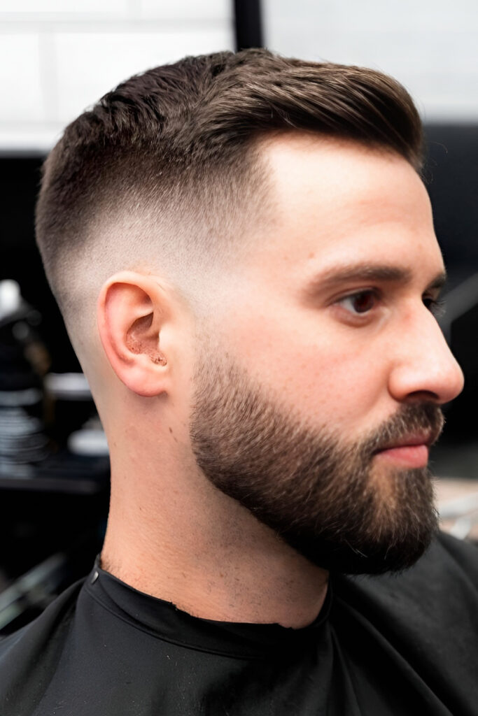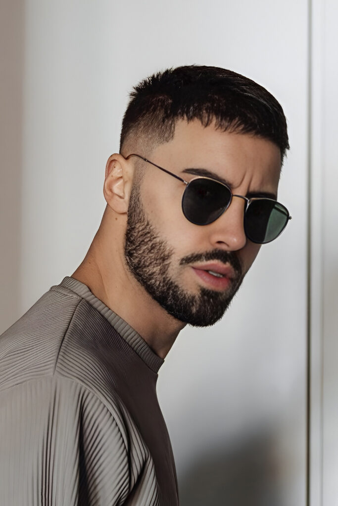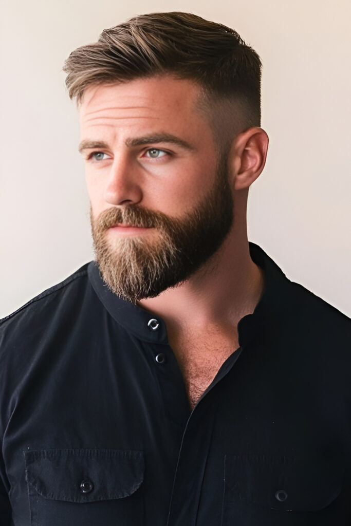 Since the hair is very short, the beard becomes the main feature. It’s a great option if you want something low-effort but still sharp.