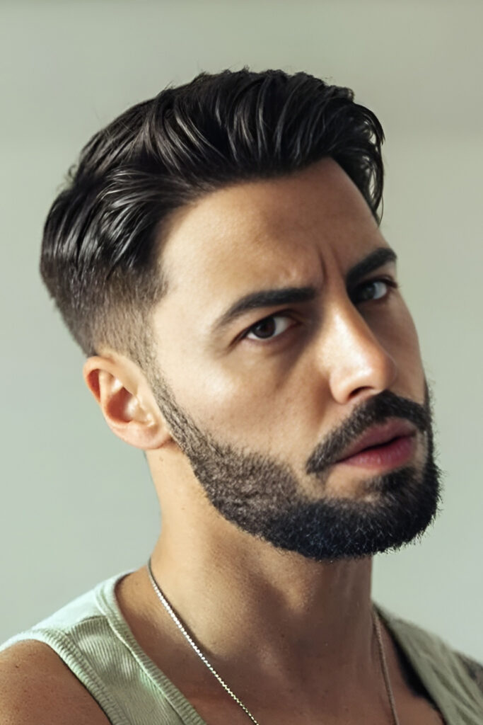 8. Slick Back Taper Fade with a Full Beard