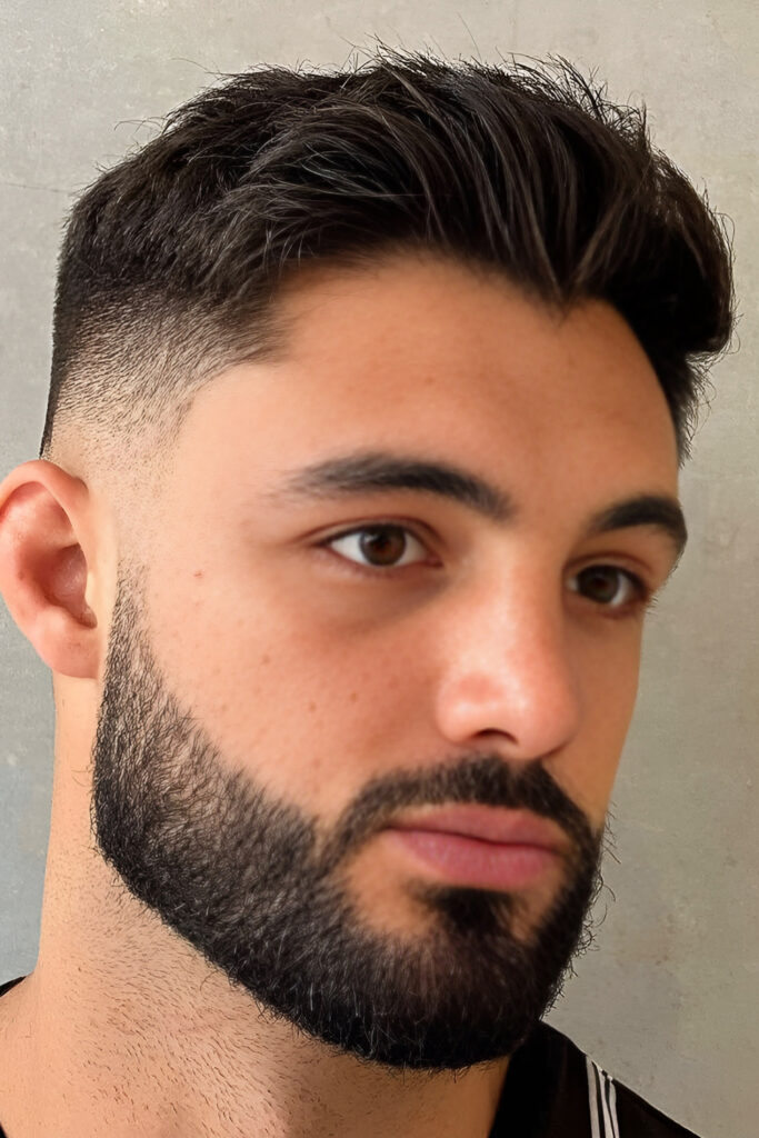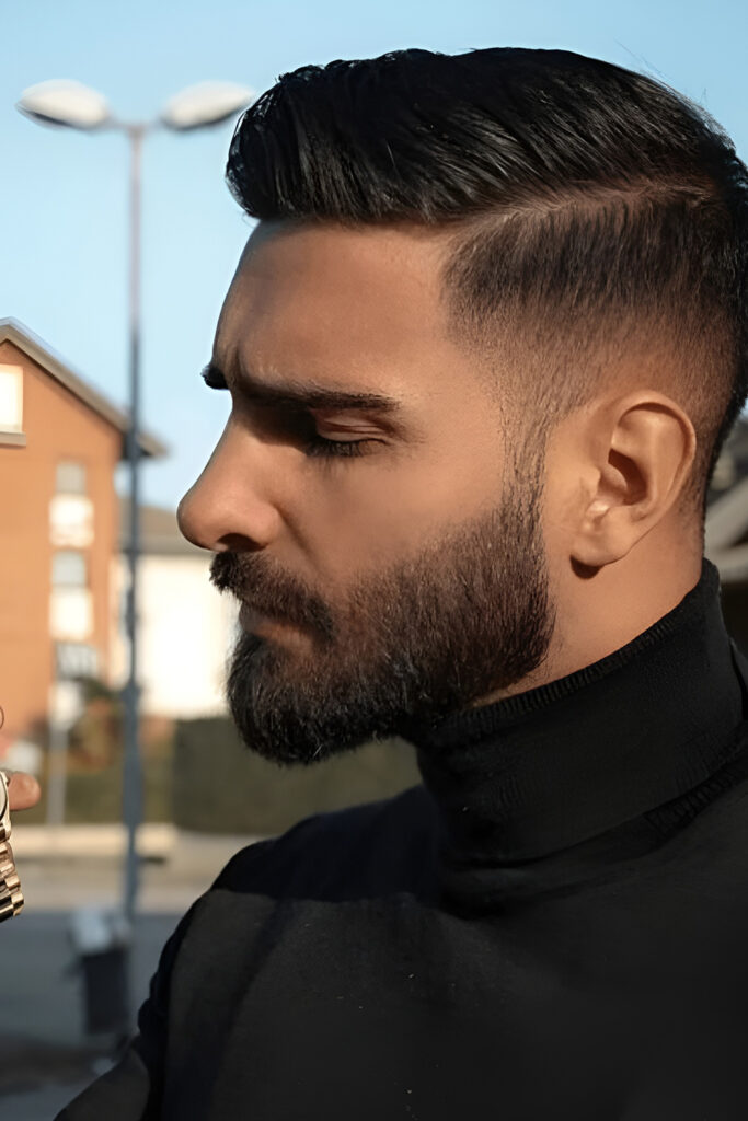 This look stands out immediately because of the contrast. The high taper creates a sharp transition, while the thick beard adds volume and presence.