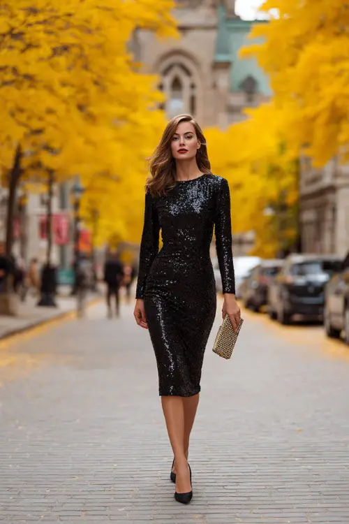 A long-sleeve black sequin midi dress is perfect for a fancy dinner or theater night. Pair it with black pumps and a metallic clutch for a look that stands out without extra effort.