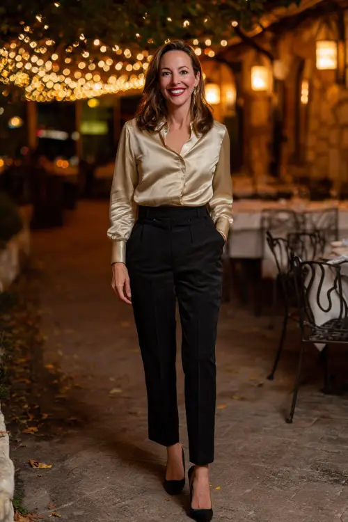 A gold satin blouse tucked into black trousers offers effortless elegance. This combination works for dinner or after-dinner drinks. Complete with pointed black pumps and a subtle necklace.