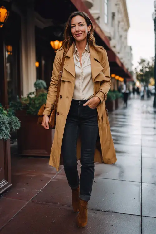 Layer a camel trench coat over dark jeans and a cream blouse for a casual date night stroll. Suede ankle boots keep it seasonal, and a crossbody bag adds practicality without losing style.