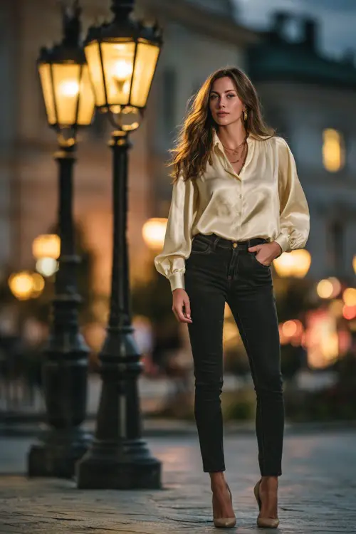 A champagne satin blouse paired with slim jeans strikes a balance between dressy and casual. Nude pumps add height and elegance, making it perfect for nights when you want to look chic without extra effort.