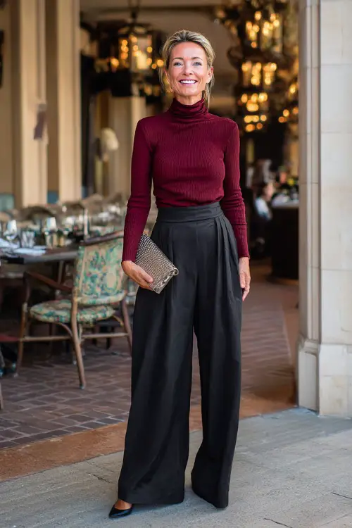 A burgundy turtleneck tucked into wide-leg black pants offers a sleek and modern look. Pointed heels keep it sharp, and a textured clutch completes a classy outfit suitable for a dinner date.
