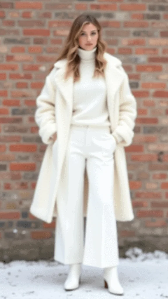 Winter whites create a fresh and cozy outfit that stands out without feeling overdone. Wearing a chunky white sweater with wide-leg trousers gives the outfit balance and a soft winter feel. A warm white coat brings texture while keeping the monochrome theme intact. It’s a clean, modern choice that feels feminine and polished, perfect for Girly Winter Outfits that lean minimal and elegant.