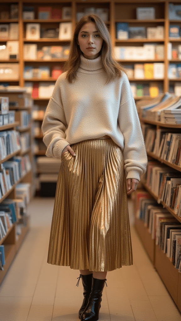 Metallic pleated skirts bring movement and shine to winter dressing. Pairing one with a cream turtleneck sweater keeps the outfit balanced, warm, and chic. Ankle boots complete the look while keeping it dressy enough for special occasions. This outfit works beautifully for winter outings that call for something sparkly yet comfortable.