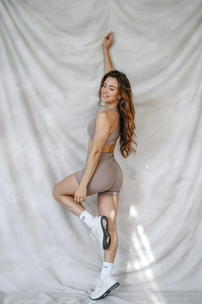 Neutral sets with soft structure bring calm and support. Thumbholes, smooth seams, and high waistbands help the outfit stay in place during movement.