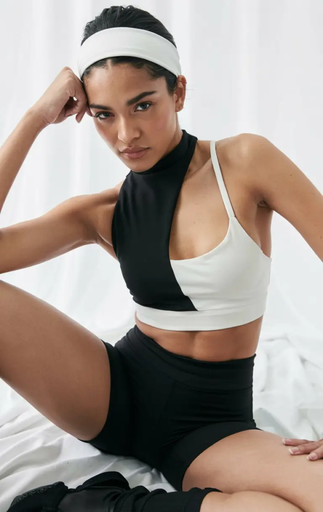 Bold contrast is a key part of Gym Fashion Trends 2026. Black and white outfits with strong lines and unique cuts bring a fashion-forward feel to gym wear. Asymmetrical tops and clean shorts give the outfit shape and edge.
