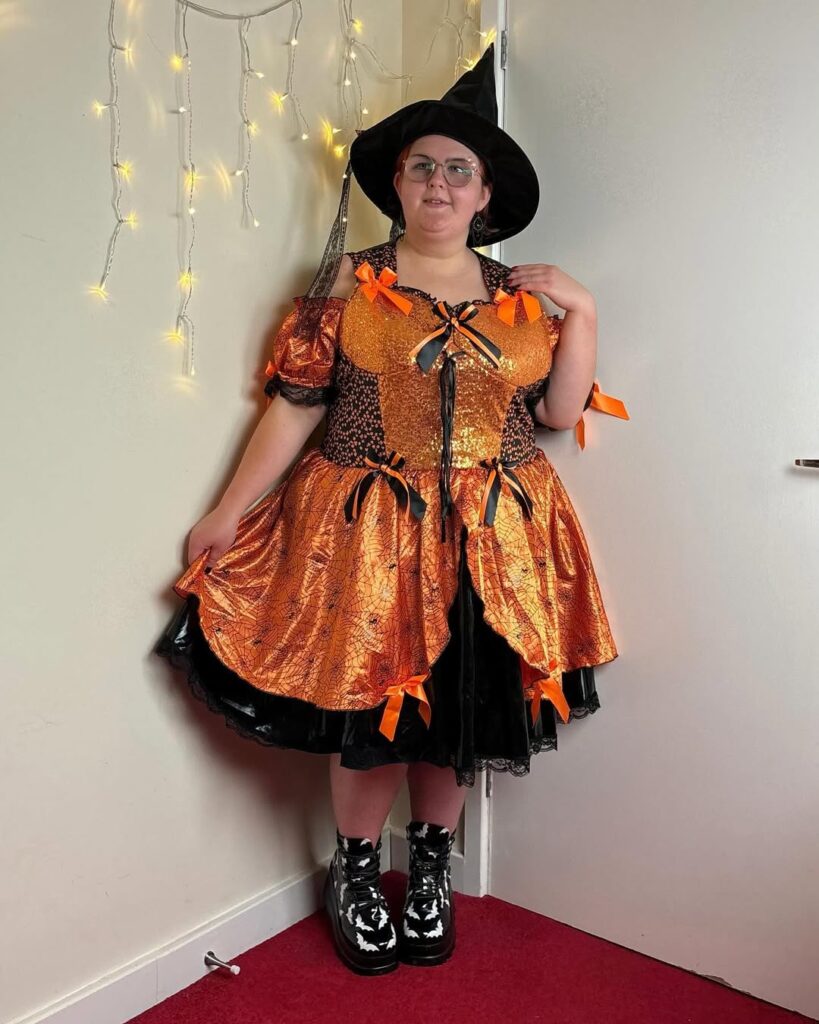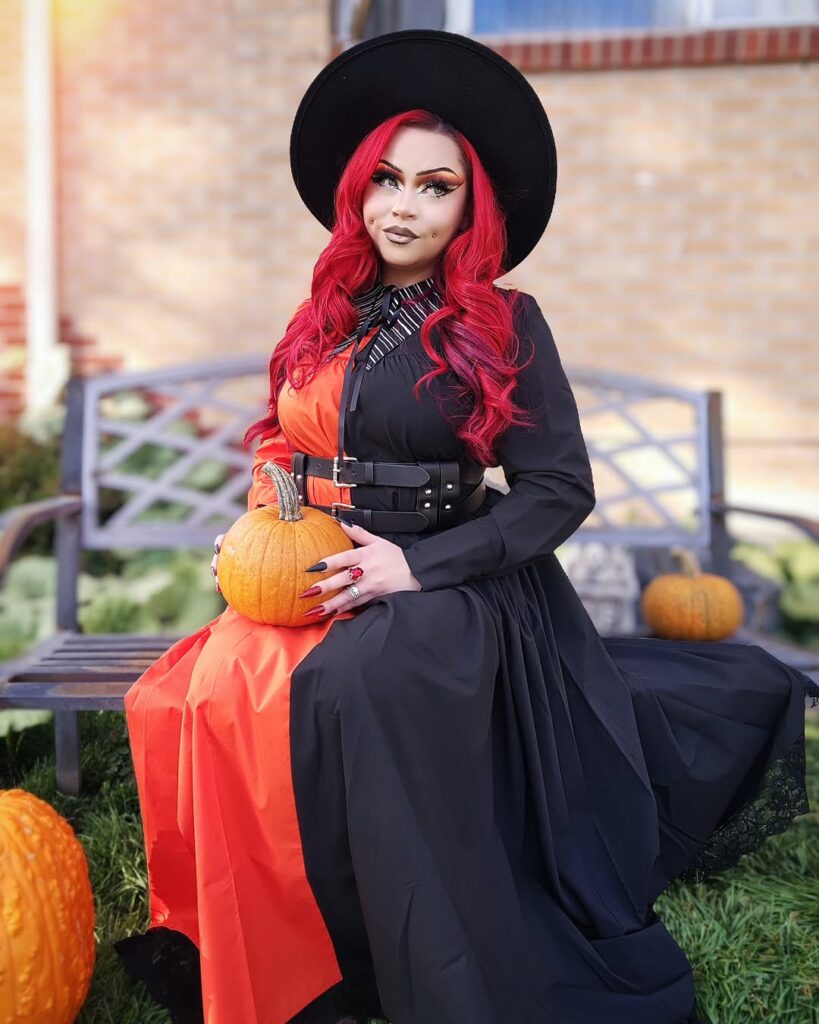 Full-length orange-and-black witch gown with bold styling and gothic accessories. Suited for parades or upscale events, this look balances drama and elegance while avoiding over-accessorizing.