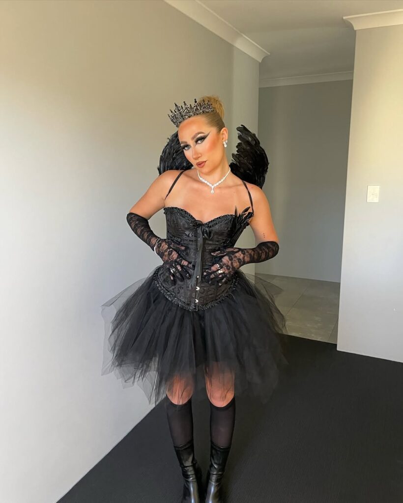 A modern, couture-inspired gothic ballet look. Black corsets, tulle skirts, and feathered accessories create a mysterious, elegant aura, best for upscale events or photo shoots. Sticking to monochrome maintains its dark sophistication.