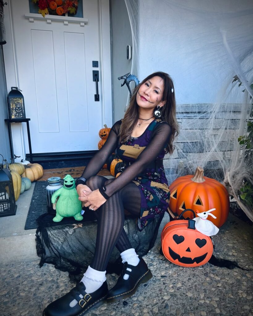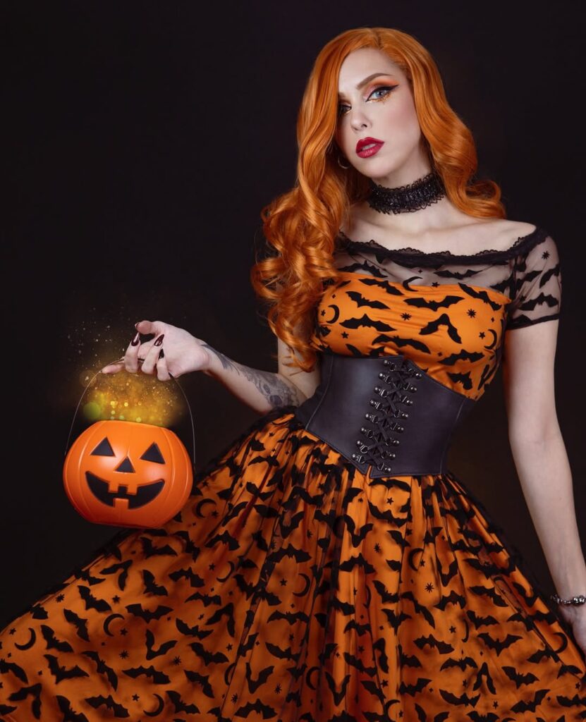 A playful, nostalgic costume featuring pumpkin and black cat motifs. Perfect for casual Halloween events or brunches, it balances cuteness with festive flair. Vintage-style pieces keep the outfit authentic.