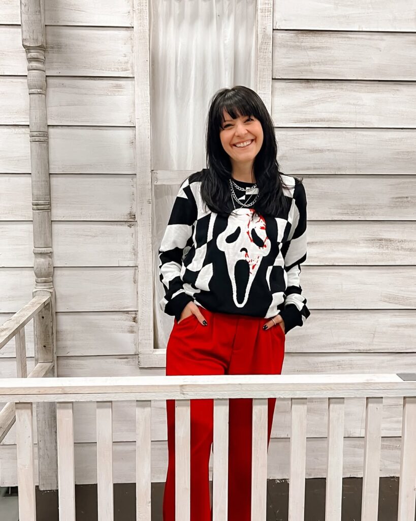 Streetwear-inspired horror with a Ghostface sweatshirt and red trousers. Casual yet edgy, it’s ideal for relaxed Halloween gatherings, movie nights, or office events. Minimal props keep the look modern and effortless.
