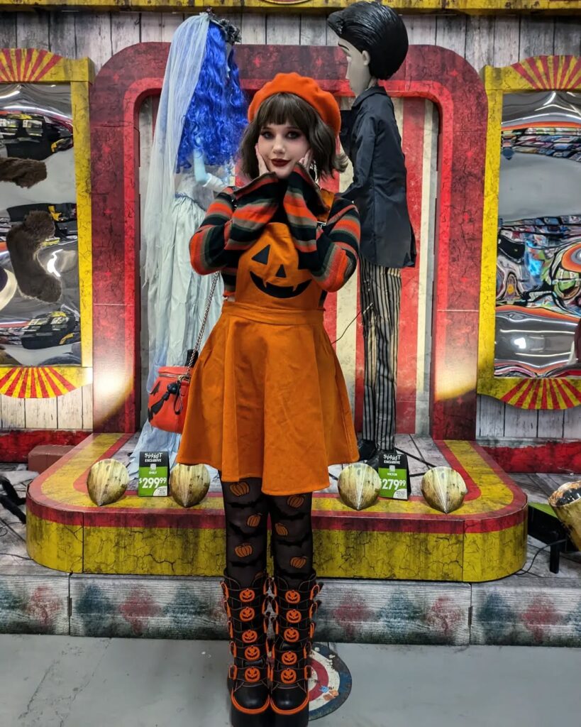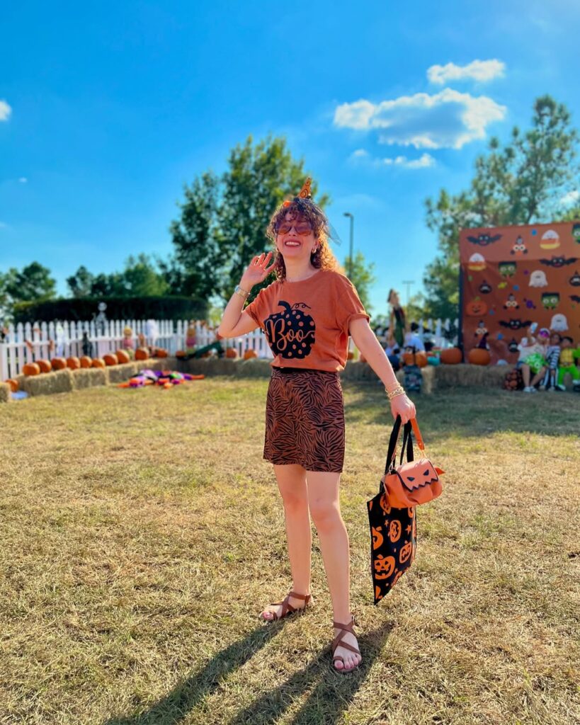 A cheerful, pumpkin-themed outfit for family-friendly or casual events. Accessories like pumpkin earrings complete the festive vibe, keeping the look bright and playful.