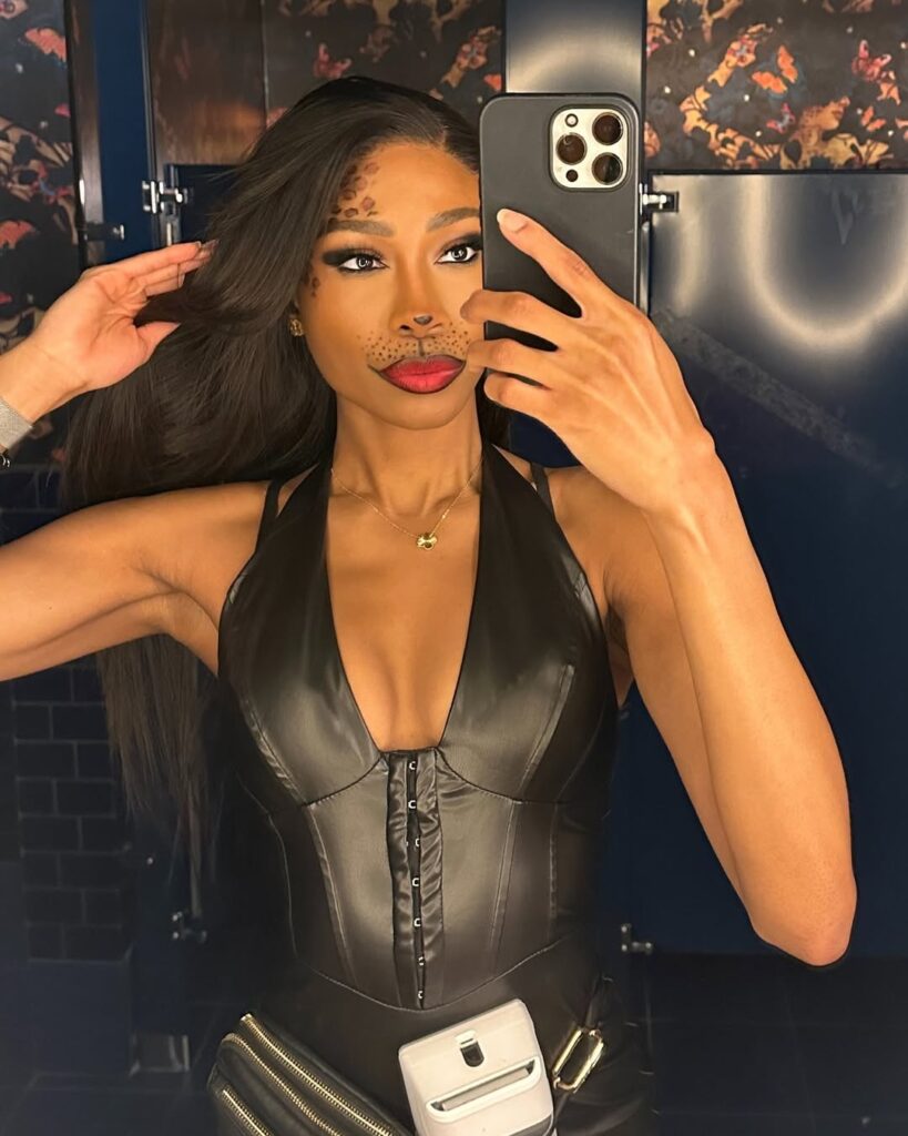 A bold, feline-inspired leather ensemble. Leopard accents and smoky makeup make it ideal for rooftop parties or edgy costume duos.