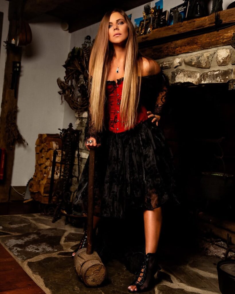 A medieval-inspired gothic look with red corset and black lace skirt. Elegant and cinematic, suitable for formal Halloween events.
