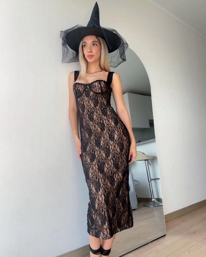 Minimalist black lace gown with subtle accessories. Refined and elegant, suited for intimate gatherings or upscale Halloween dinners.