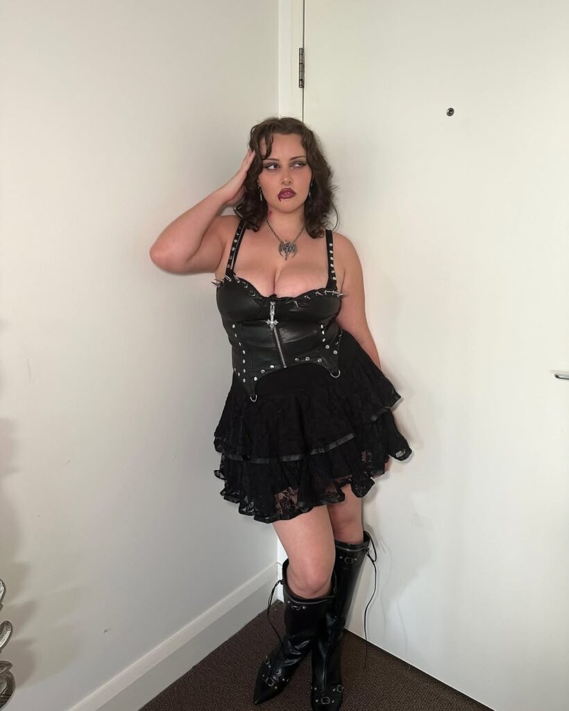 Black corset and ruffled skirt combine pin-up glamour with a spooky aesthetic. Perfect for burlesque, goth clubs, or themed couple shoots.