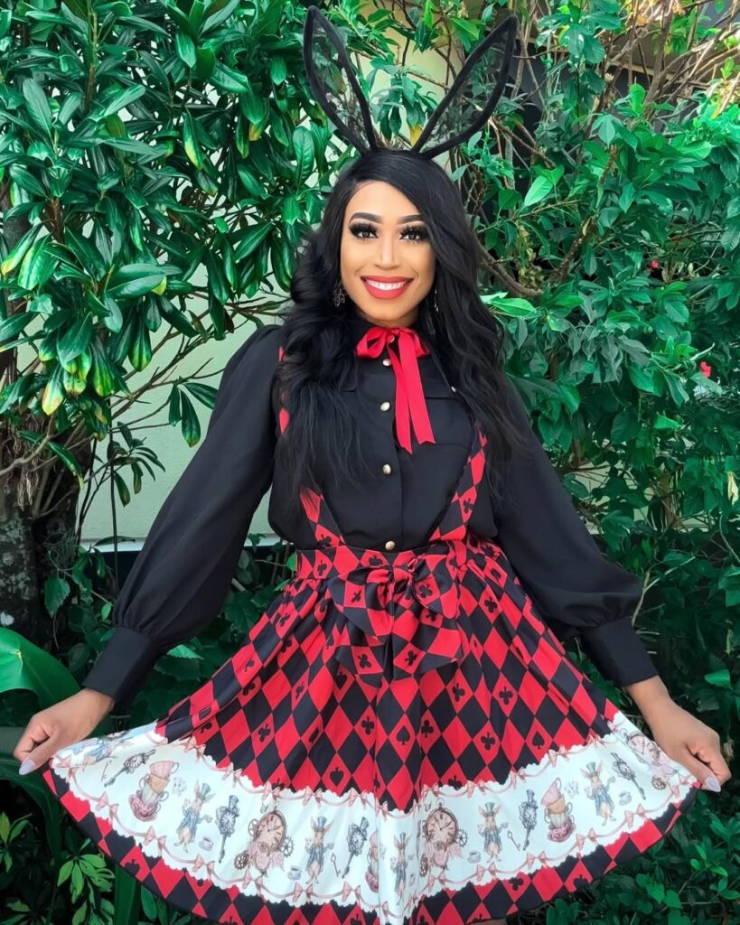 Alice-in-Wonderland-inspired bunny look with playful red-and-black prints. Suitable for themed brunches or family-friendly events, keeping the look whimsical.